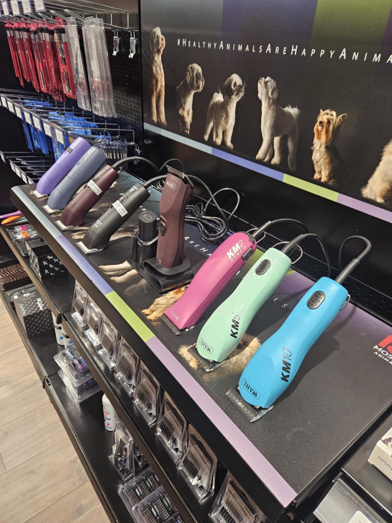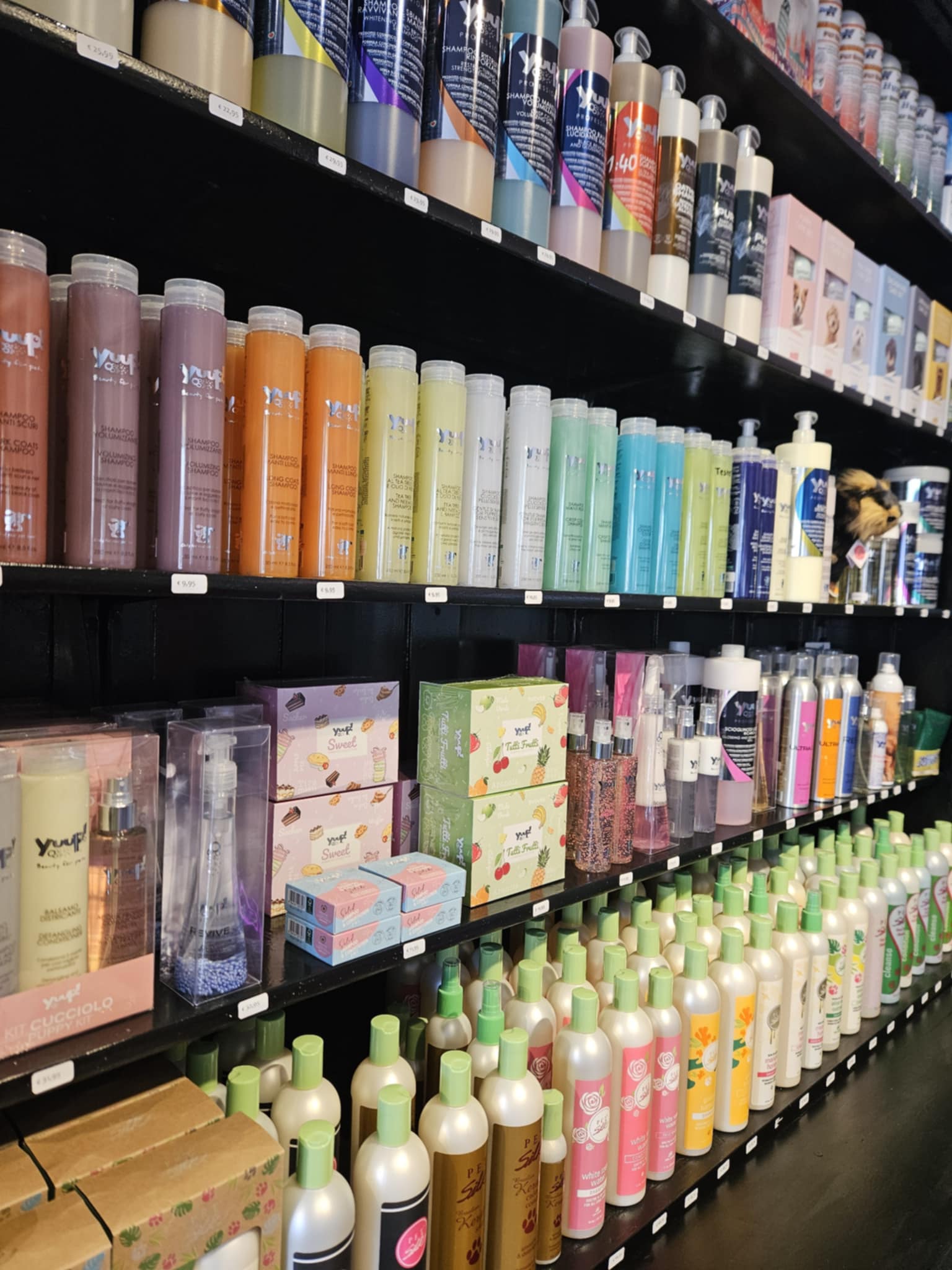 Daarnaast hebben we een kast van maar liefst vier meter lang, gevuld met shampoos, conditioners, parfums en verschillende sprays om de vacht van jouw hond in top conditie te houden. Ook kun je bij ons waterblazers zien en horen, ideaal als je twijfelt tussen modellen of voor het eerst een blazer overweegt.